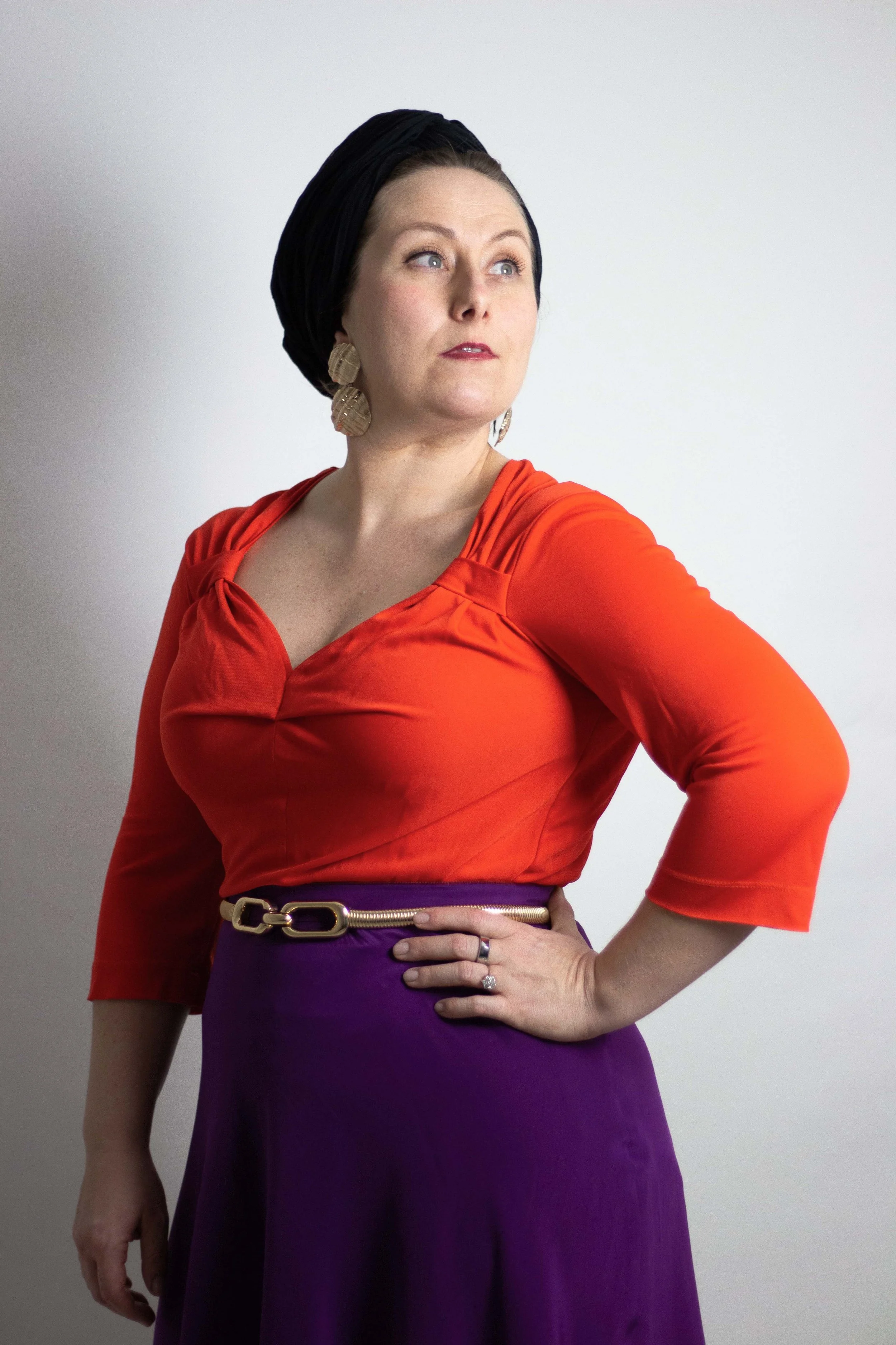 The orange jersy top and the purple skirt is an example off how different colours with the same bright shade can match.
