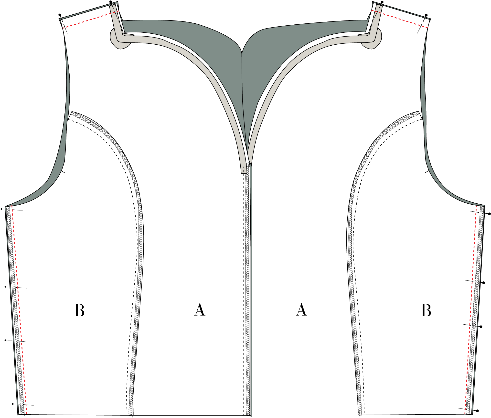 9. Place the front side bodice (B) right sides together with the front bodice (A) and sew the seam.