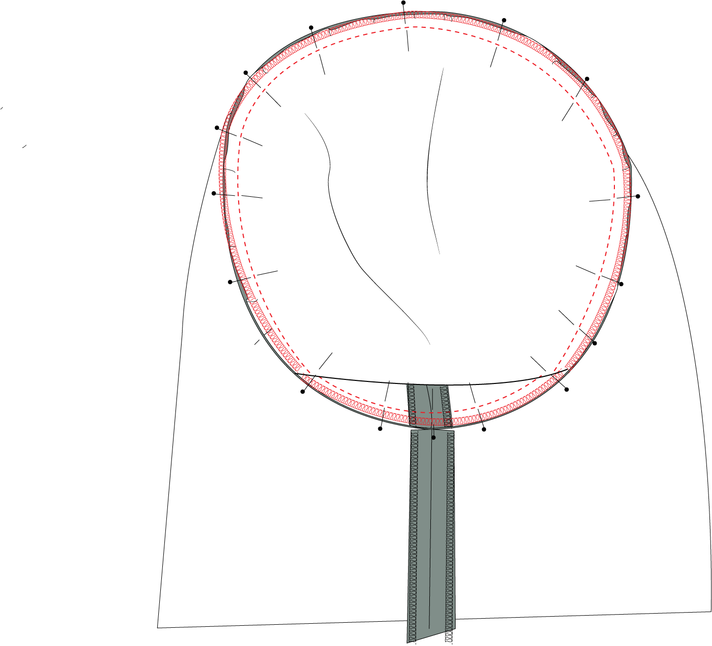 17. Place the neck facing onto the neckline of the bodice, right sides together. Match all seams carefully. First sew the right side of the neckline, then the left side as follows: